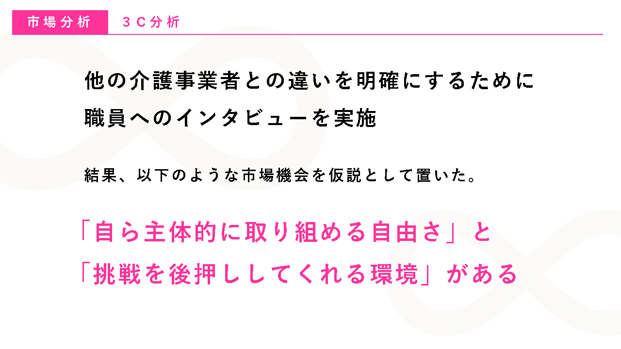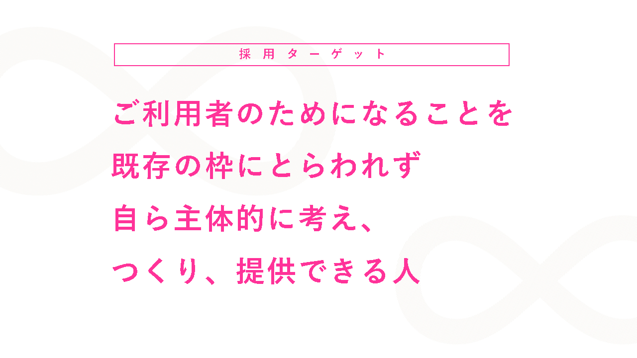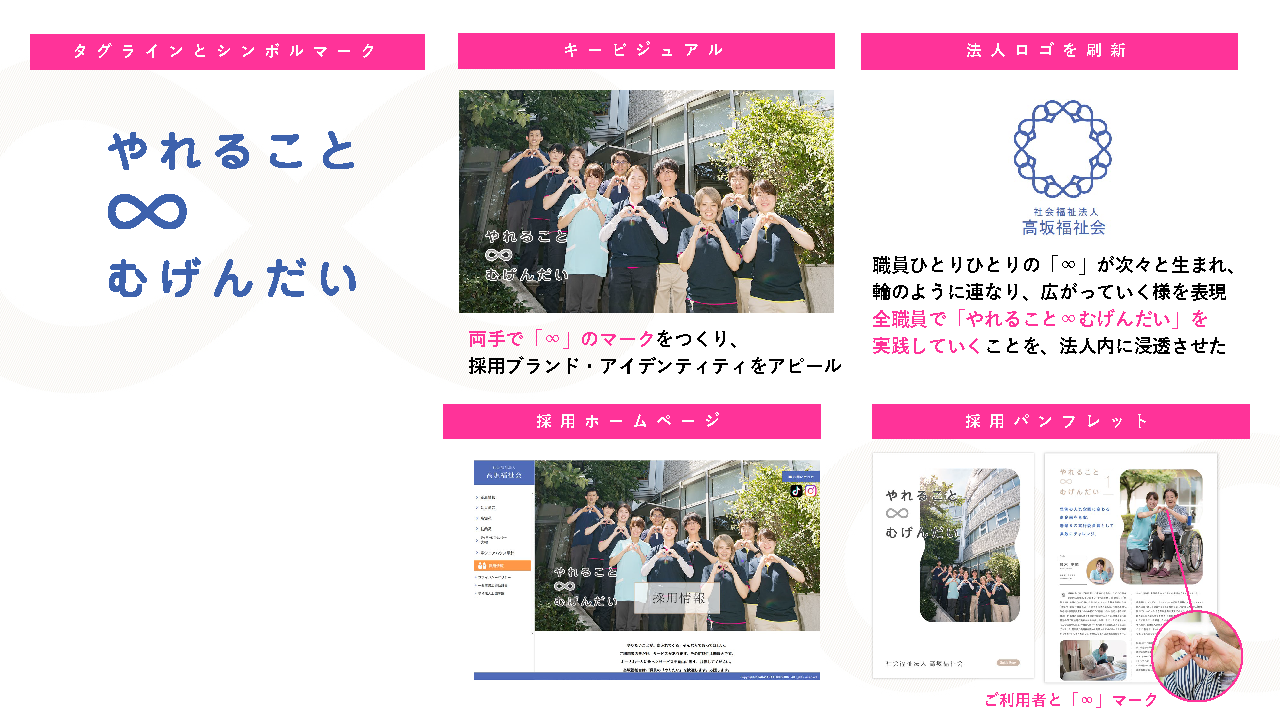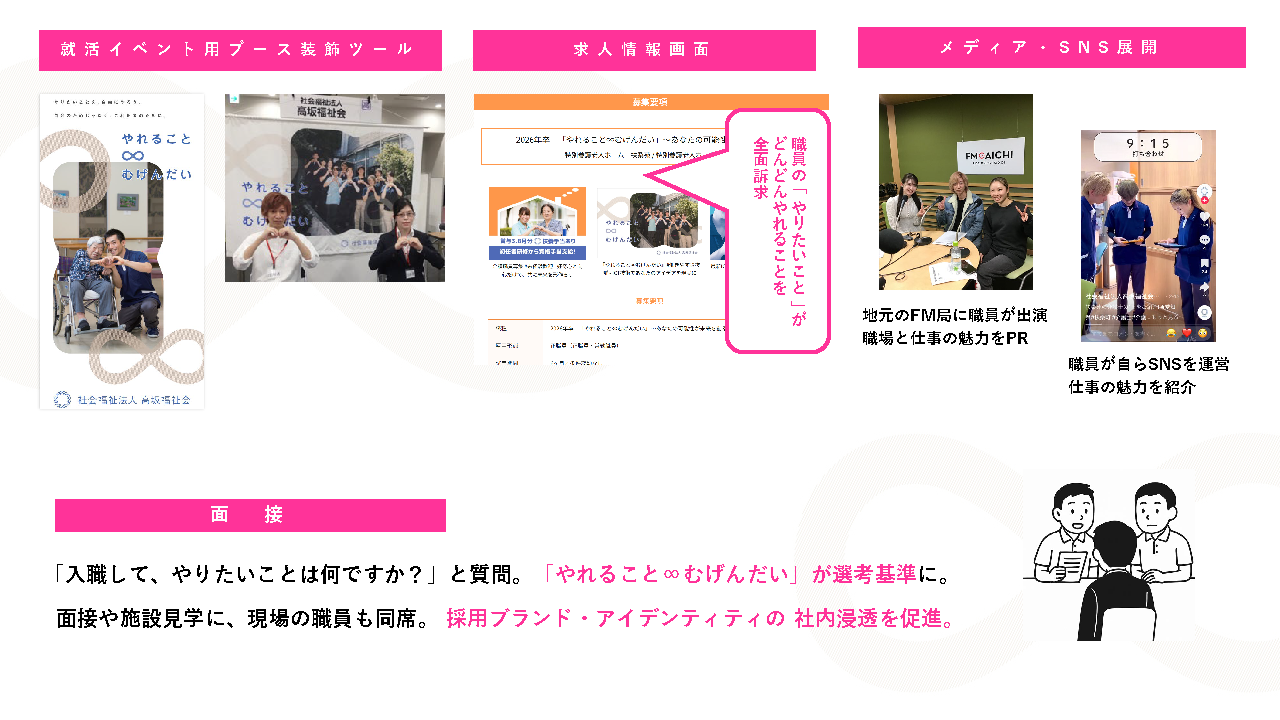 ブランディングでは、ほかの介護事業者との違いを明確化するために、職員へのインタビューを実施。そこで得た情報をもとに「職員のチャレンジを全面的にバックアップする」「自ら主体的に取り組める自由さがある」などの強みを発見。そこから「自分のやりたいことがのびのびとやれる、どんどん追求できる環境があること」が“高坂福祉会らしさ”であると捉え、採用ターゲットは「ご利用者のためになることを既存の枠にとらわれず自ら主体的に考え、つくり、提供できる人」と設定。採用ブランド・アイデンティティは「自分の『やりたい』が、無限の可能性の中で、どんどんやれる。」と決めました。また、「やれること∞むげんだい」というタグラインを作り、タグラインをベースにしたロゴも制作しました。求人広告では、職員の「やりたいこと」がやれる環境であることを全面訴求したほか、面接では「入職して、やりたいことは何ですか?」と質問するなど、「やれること∞むげんだい」を選考基準に設定。さらに若手職員が主体となってSNSで採用広報を展開したほか、地元FM局に職員が出演して魅力をPRしました。