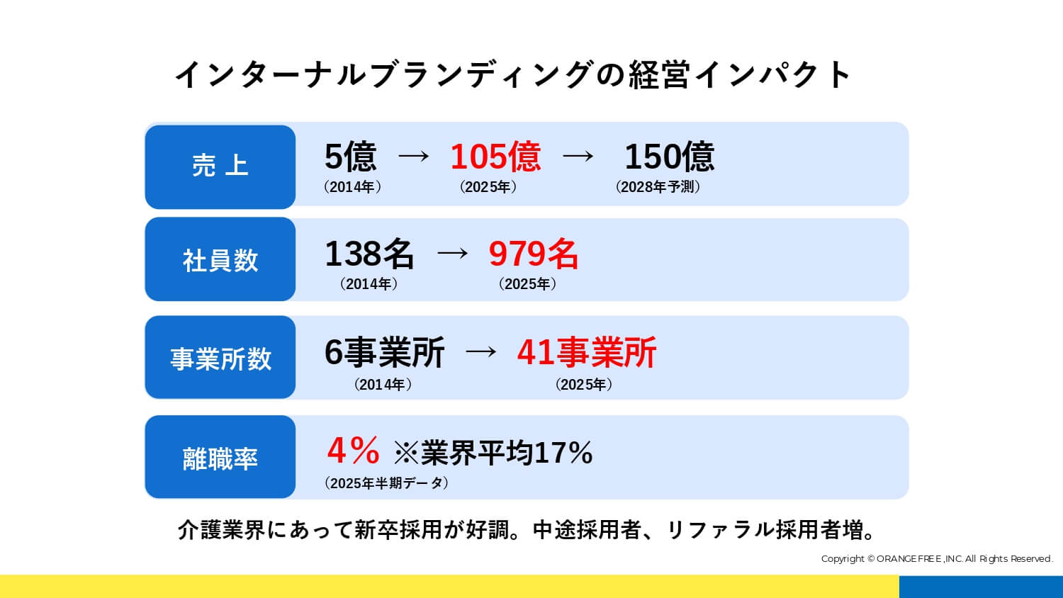 翌年には第3期インターナルブランディングとして、現場を担う若手リーダーを対象に、ブランドを「自分ごと」として捉え、日々の判断や行動に反映できる人材を育成するプログラムを実施。これらの成果は数字に明らかです。GROUPの年商は、ブランディング当初の5億円から100億円規模へと成長。離職率はわずか4%。新卒採用、リファラル採用も好調です。