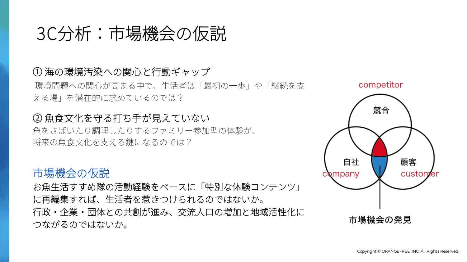 次に地域ブランディングへと展開。3C分析では「海洋汚染への関心はあるが行動に移せないギャップ」「魚食文化を守るための具体策の不足」という課題が浮き彫りに。生活者が“最初の一歩を踏み出せる場づくり”と、“ファミリーで参加できるお魚体験”が未来の魚食文化を支える鍵になると考えました。