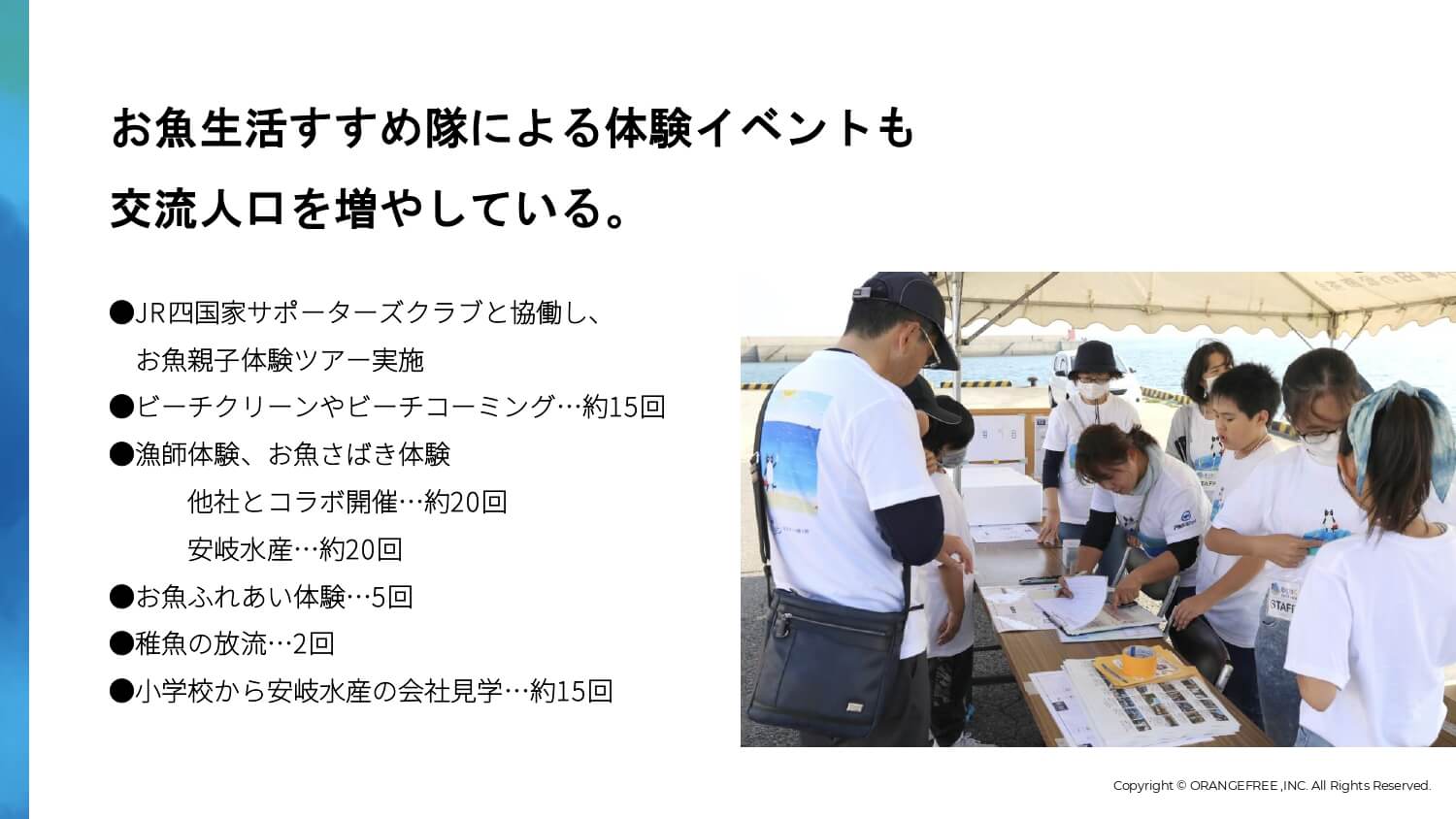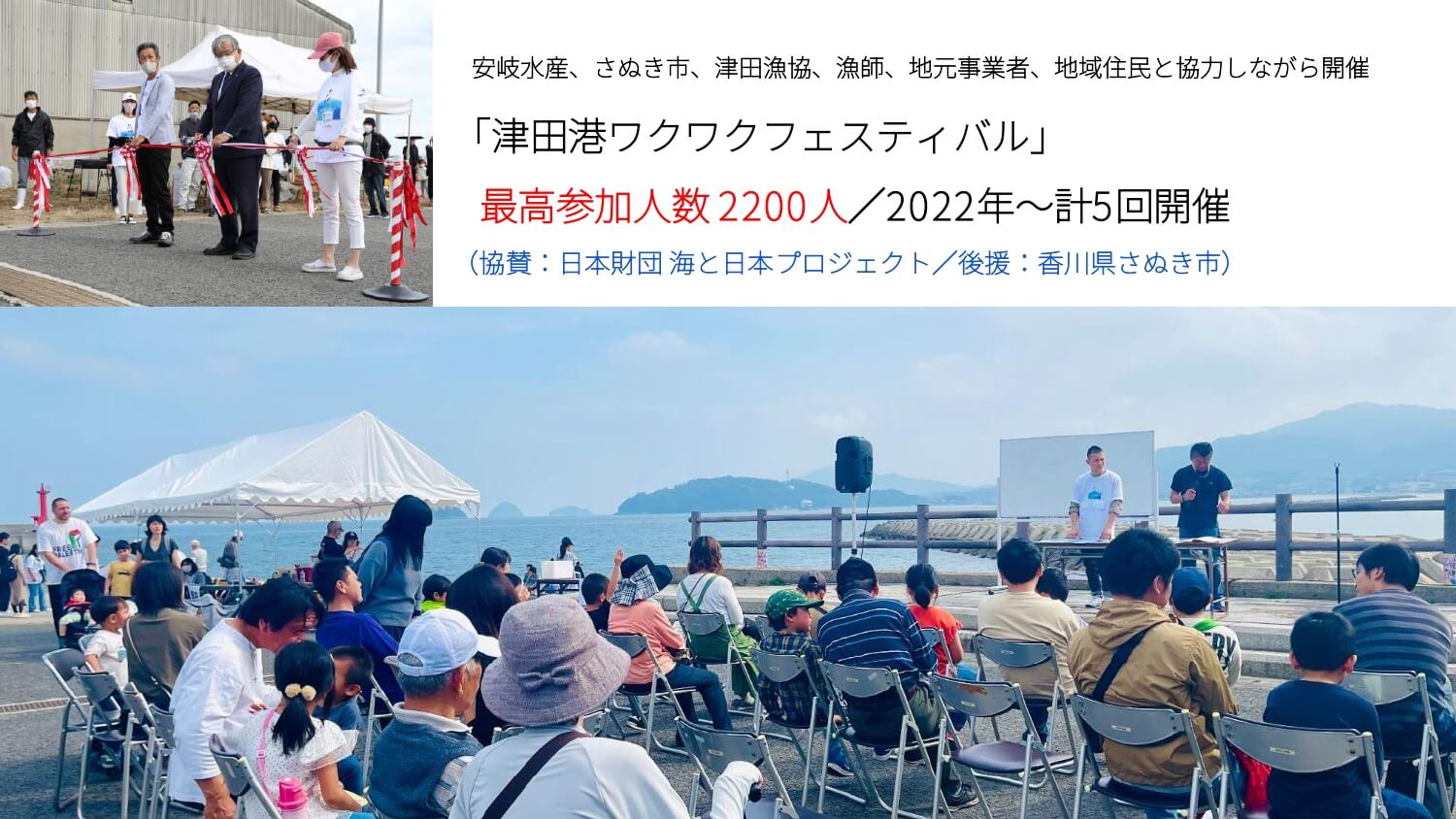 その結果、安岐水産、さぬき市、津田町漁協、漁師、地域住民らが共創した「津田港わくわくフェスティバル」は最高2200名を動員し、人口の2.4人に1人が訪れるイベントに成長。お魚生活すすめ隊の体験も交流人口を着実に拡大させ、安岐水産の認知度と企業価値も向上。「ウラツダ」エリアでも新規出店が進むなど、地域に新たな賑わいが生まれました。