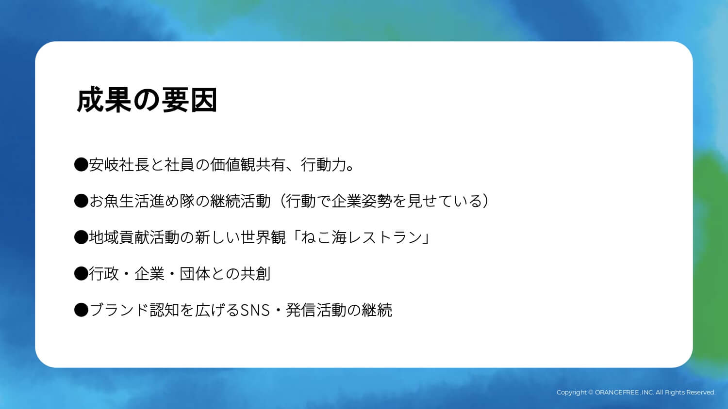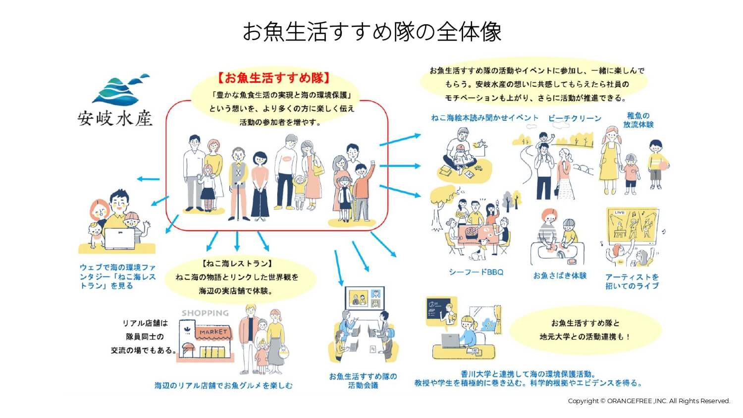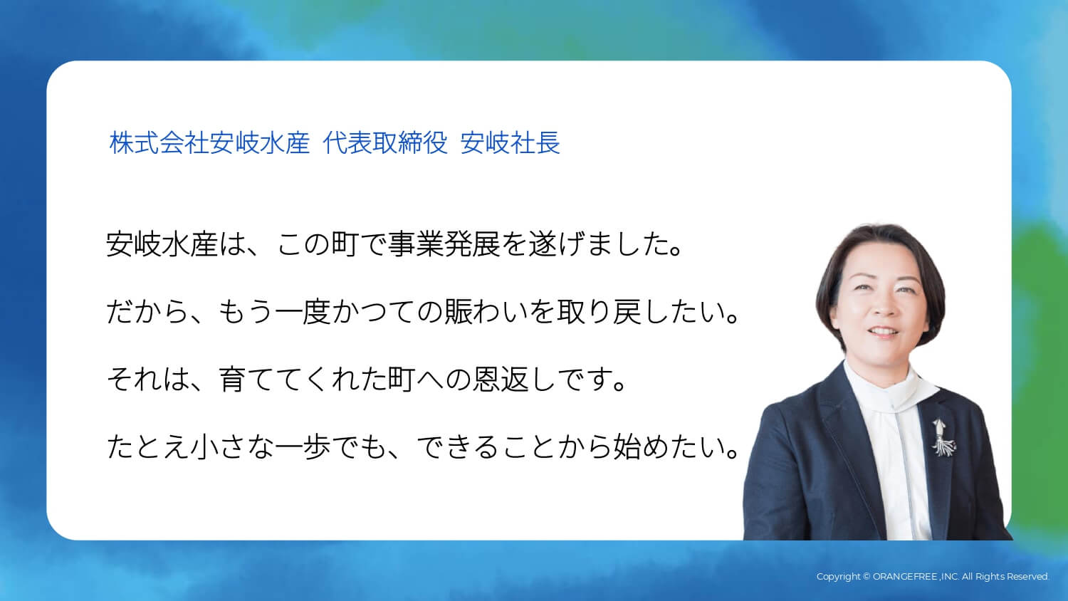「過疎地域に指定された海の町で 企業主導型の地域ブランディング」は、香川県さぬき市津田町を舞台に、地元の水産加工会社・安岐水産が中心となって進めた地域ブランディングの事例です。過疎化や海洋汚染、魚食離れが進む中、安岐麗子社長は「かつての賑わいを取り戻したい」と社員とともに「お魚生活すすめ隊」を結成し、海と魚食文化を守る活動を始めました。しかし、自社だけでは限界を感じ、オレンジフリーに相談。オレンジフリーは企業と地域のブランディングを重ね合わせて進める“企業主導型の地域ブランディング”を提案しました。