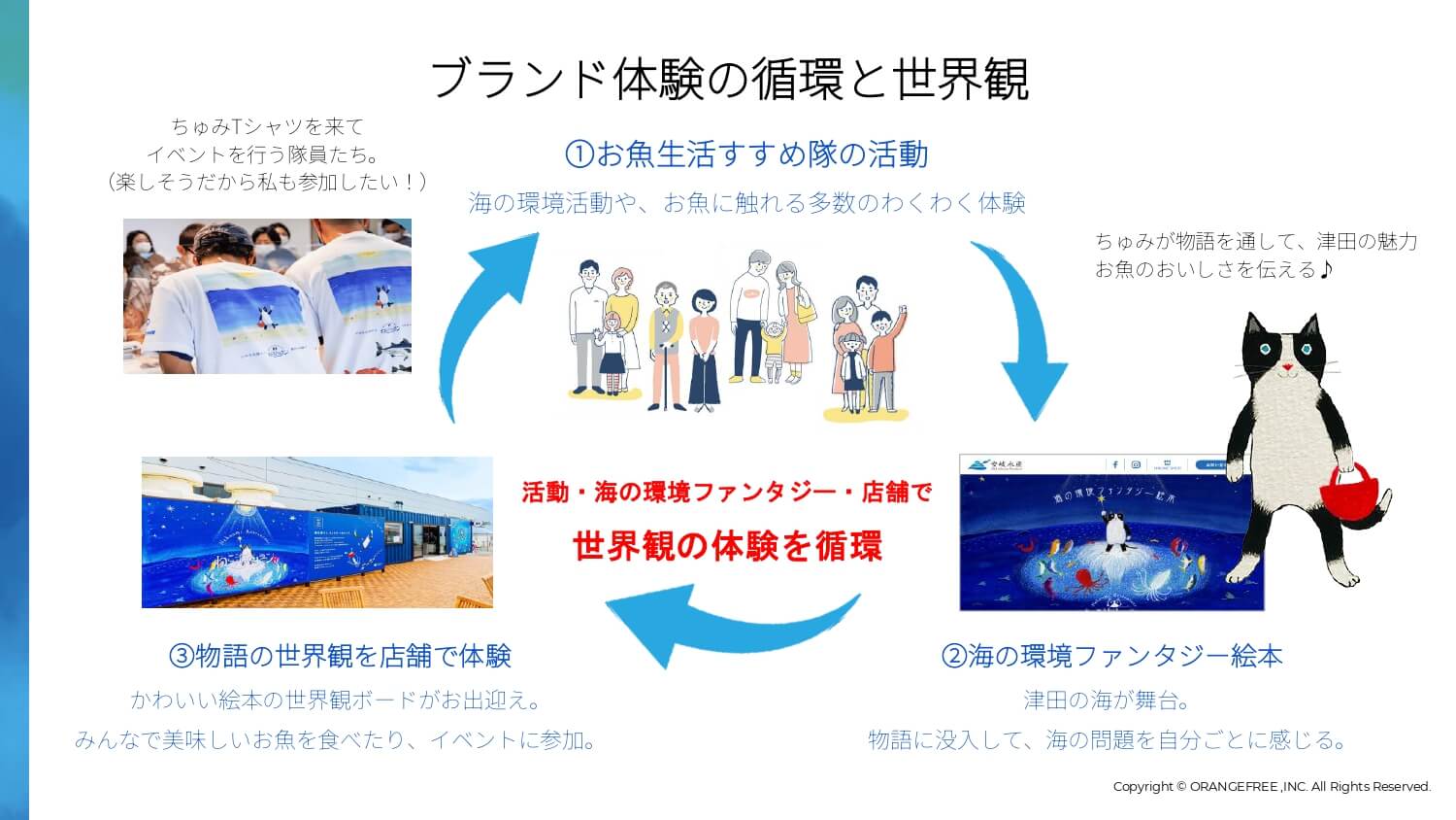 そこで、「お魚生活すすめ隊」の活動を体験コンテンツとして再編集し、バーベキュー、お魚さばき体験、ビーチクリーンなどをデザイン。さらに、海の環境ファンタジー絵本『ねこ海レストラン』を企画し、津田町の魅力と海ごみ問題への気づきを物語として表現。社屋裏のコンテナショップも物語の世界観に合わせて「ねこ海レストラン」へとリノベーションしました。