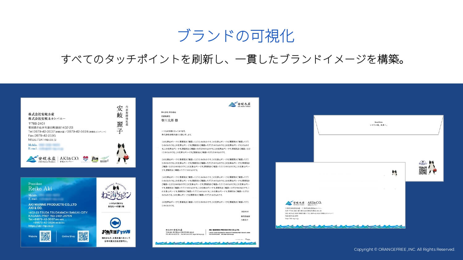 まず安岐水産のリブランディングに着手し、幹部と共にブランドの核を再定義。ブランド・アイデンティティを「瀬戸内から贈る、ひとクラス上のお魚生活」、ブランド・ビジョンを「いのちの海。未来へ。」と策定し、あらゆるタッチポイントで可視化しました。