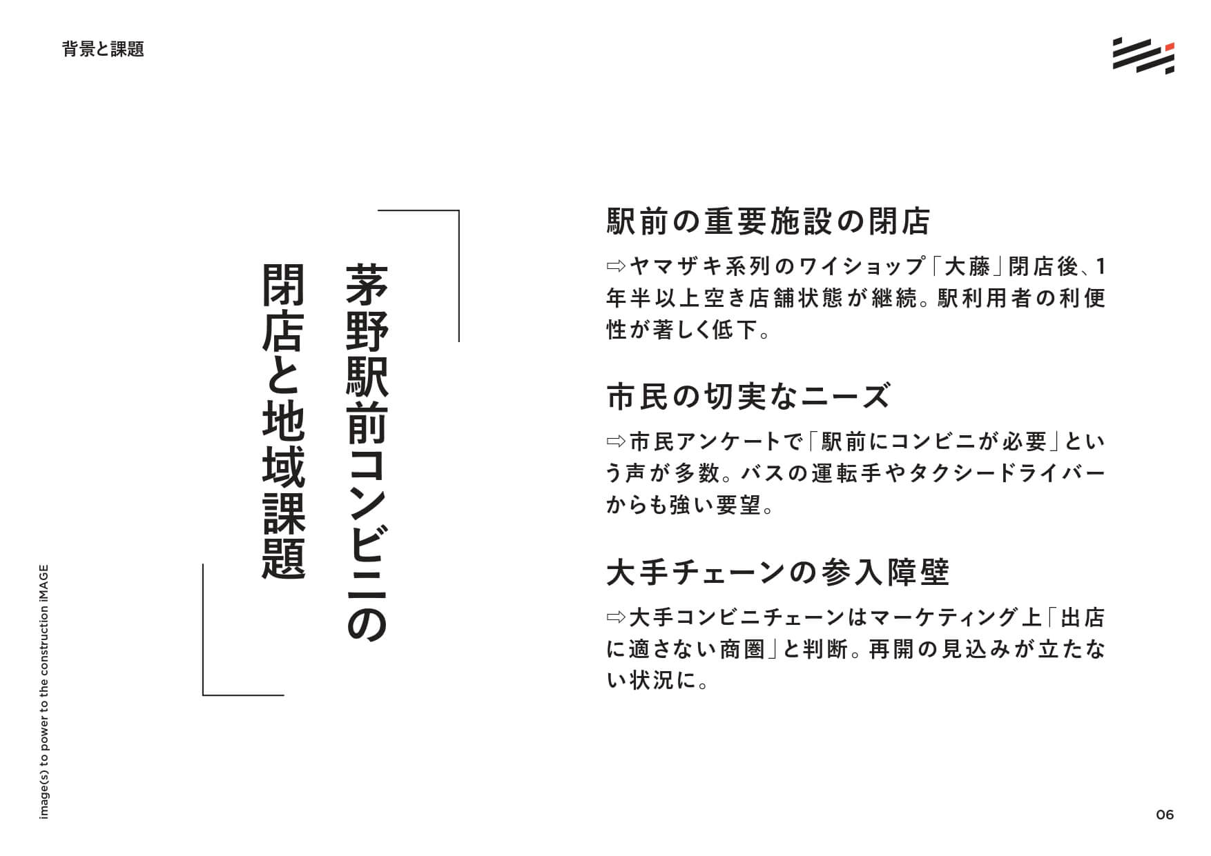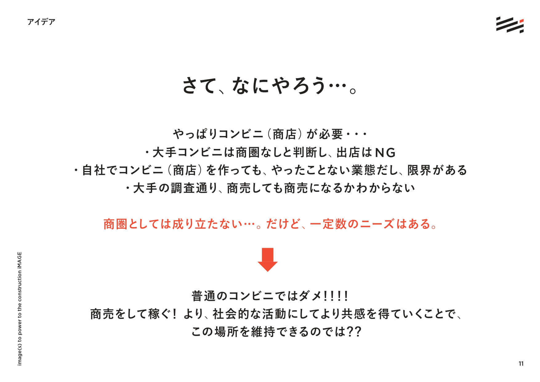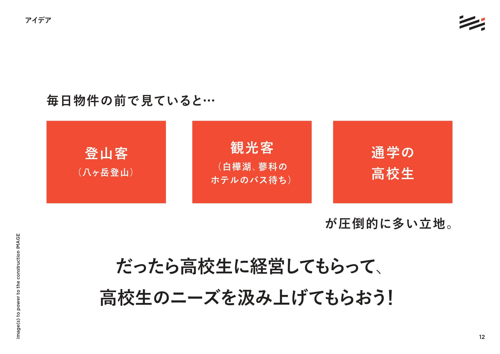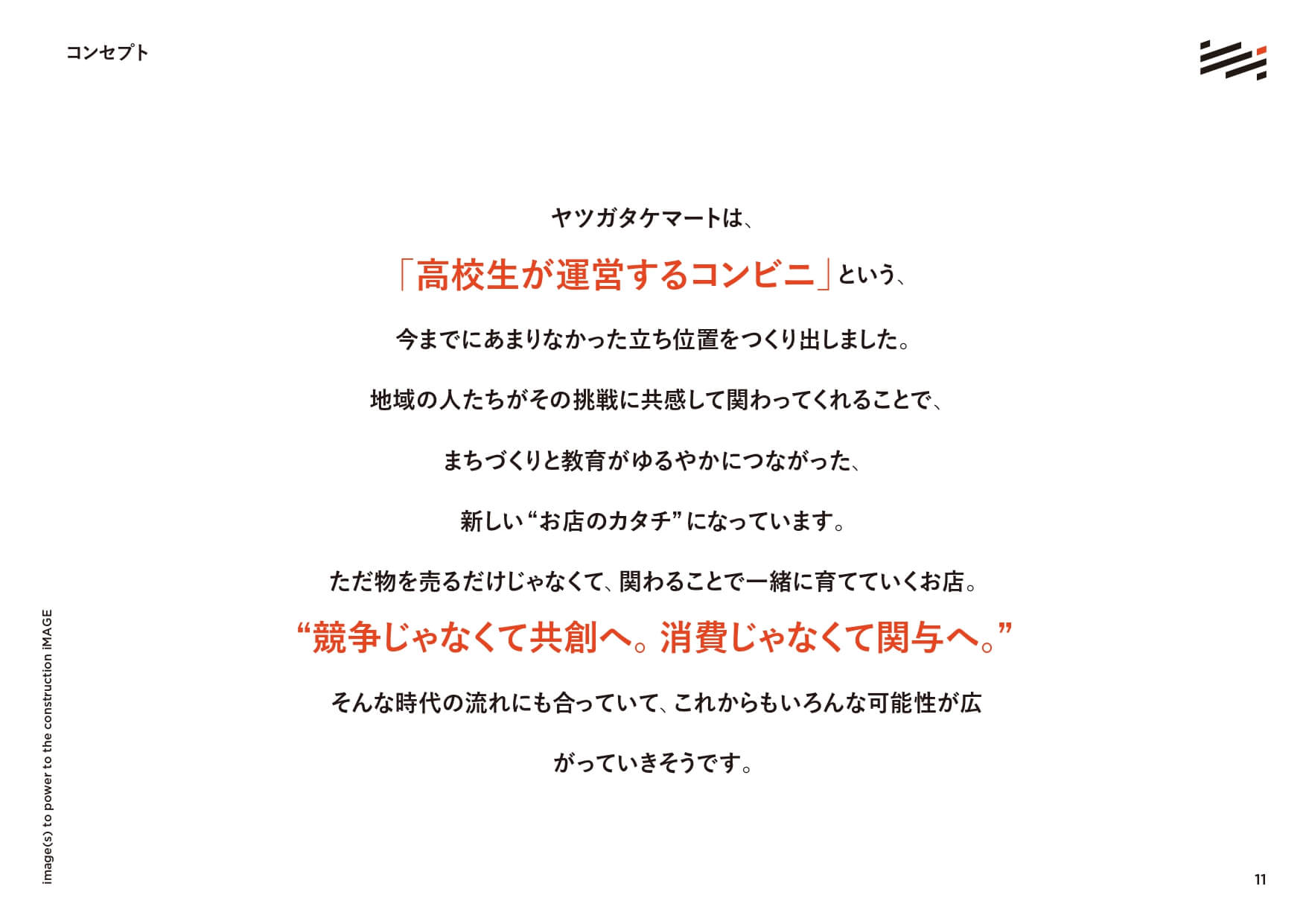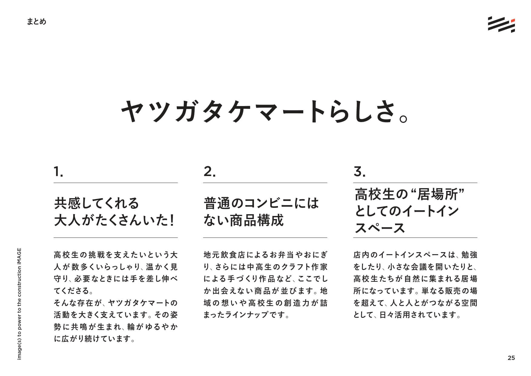 コンビニは、経営はイマージ、運営は村議会議員が社長を務める会社が行い、社員は高校生という体制に決定。「競争じゃなくて共創へ。消費じゃなくて関与へ」をコンセプトに、新しいコンビニの形を模索し、八ヶ岳を店名に据えたコンビニ「ヤツガタケマート」が誕生。タグラインは「関与」してもらうことを意識して「つなぐ」という言葉を用いた「人と街と山をつなぐコンビニ」と決めました。